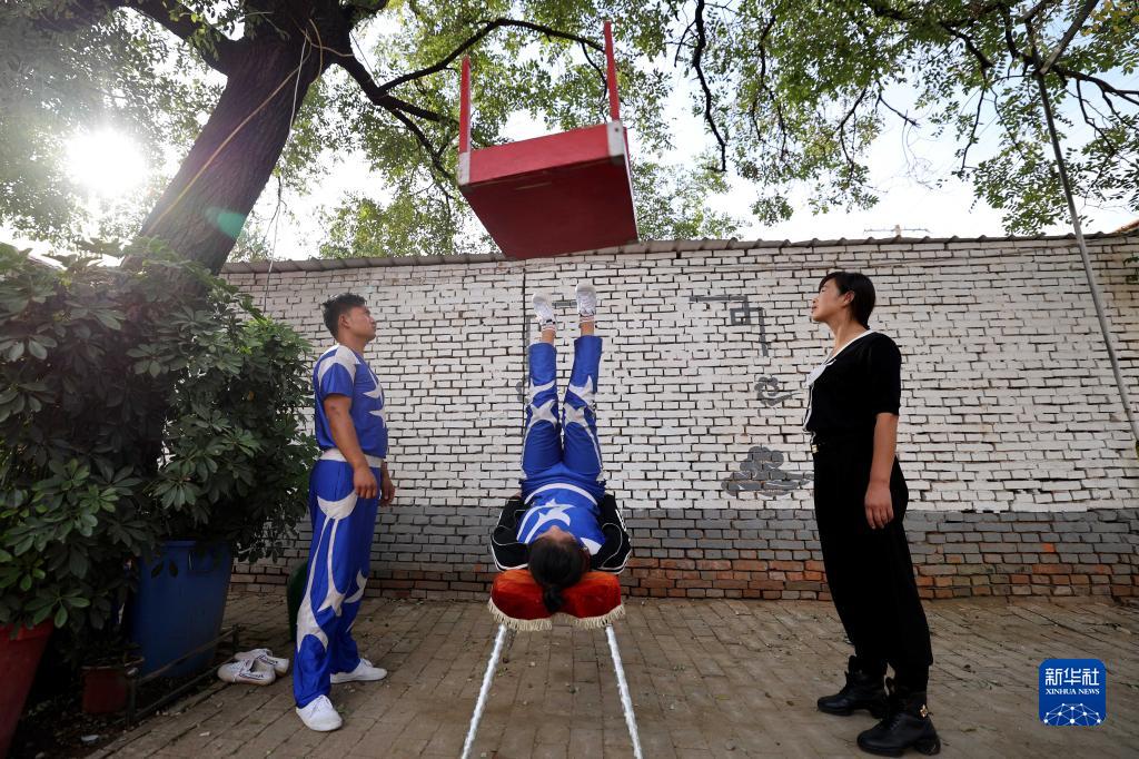 10月18日,在河北省滄州市吳橋縣鐵城鎮張松村一特色雜技小院,雜技老師指導雜技學(xué)員練習雜技。