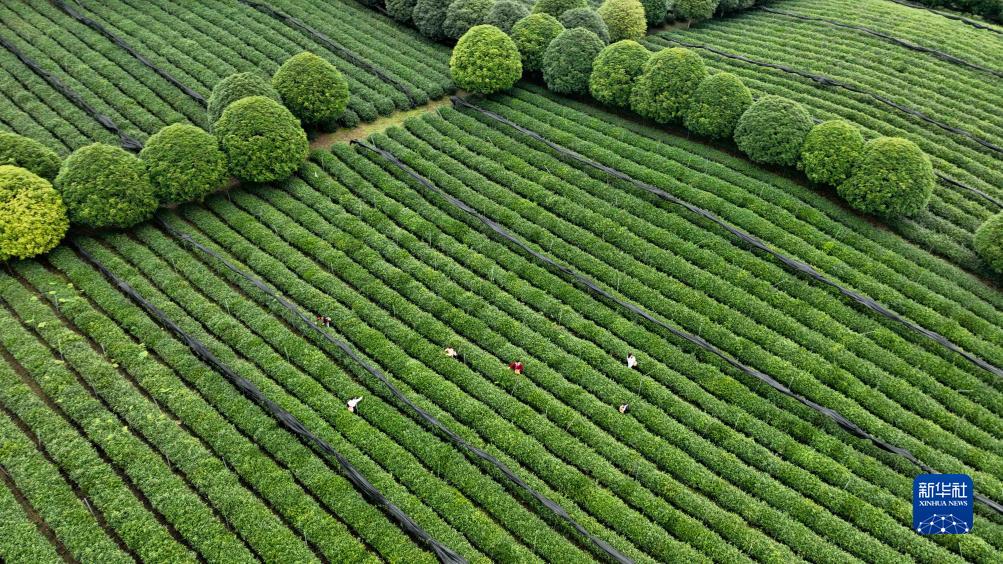 10月18日,茶農在貴州省遵義市鳳岡縣永安鎮田壩社區茶園內采摘秋茶(無(wú)人機照片)。