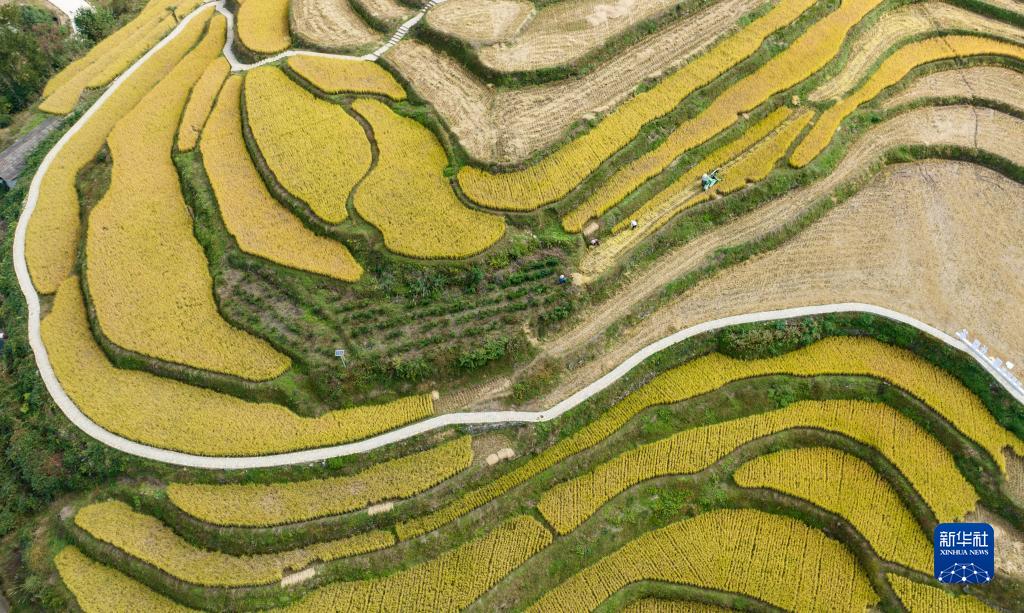 10月18日,村民在湖北省宜昌市秭歸縣長(cháng)春村稻田里收割水稻(無(wú)人機照片)。
