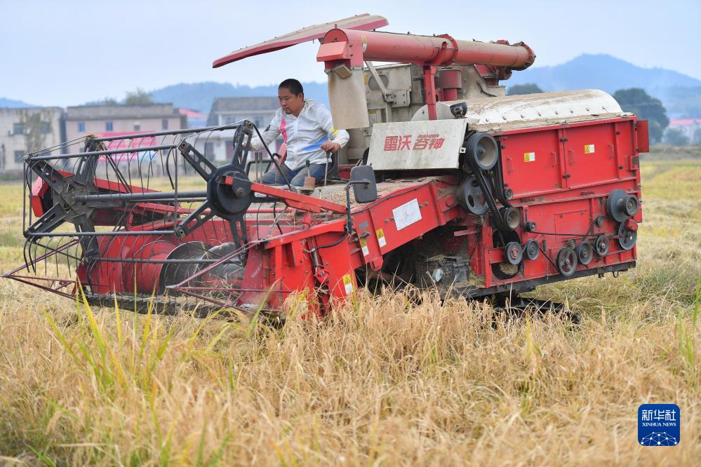 10月19日,在湖南省湘潭市雨湖區鶴嶺鎮晶鑫村,農戶(hù)駕駛農機在農田里收割水稻。