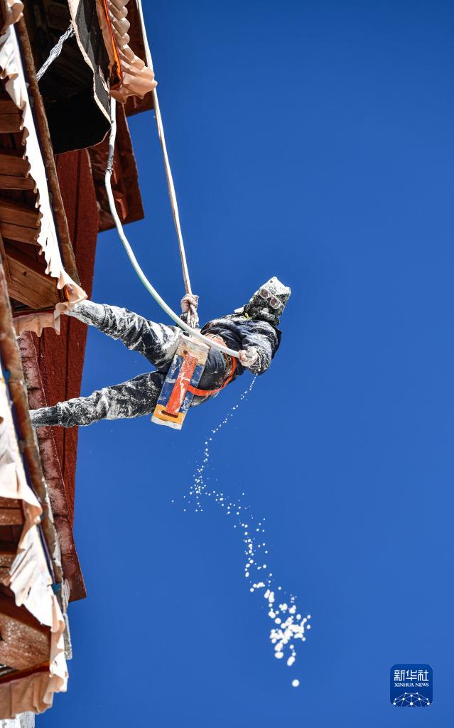 工作人員對布達拉宮外墻噴灑涂料(10月18日攝)。