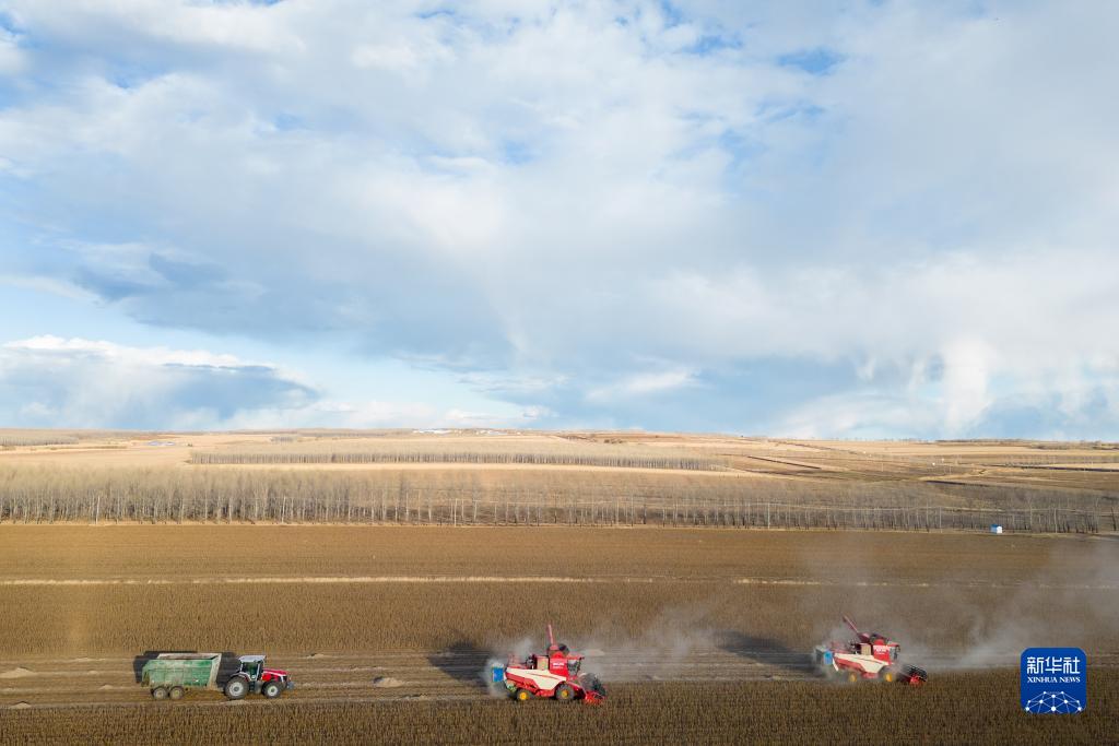 10月19日,收割機在齊齊哈爾市甘南縣中興鄉綠化村的一處大豆地收獲大豆(無(wú)人機照片)。