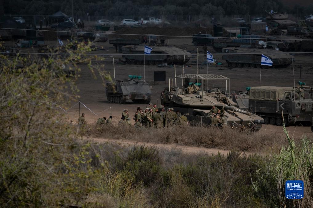 這是10月19日在加沙邊境以色列一側拍攝的集結的以軍戰車(chē)和人員。