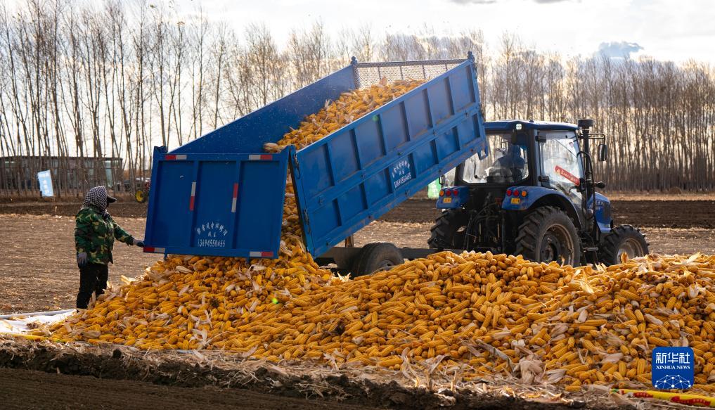 10月19日,在黑龍江省肇東市五里明鎮東升村,農民把收獲的玉米運到當地農業(yè)合作社指定地點(diǎn)進(jìn)行晾曬。