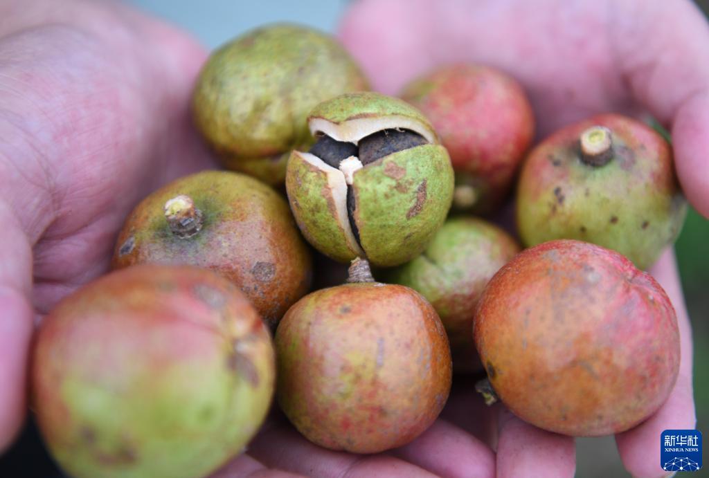 在乳源瑤族自治縣石角塘村的油茶省級現代農業(yè)產(chǎn)業(yè)園,工作人員展示采摘的油茶果(10月18日攝)。