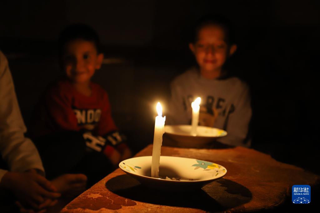 這是10月20日在加沙地帶南部城市汗尤尼斯拍攝的使用蠟燭照明的兒童。