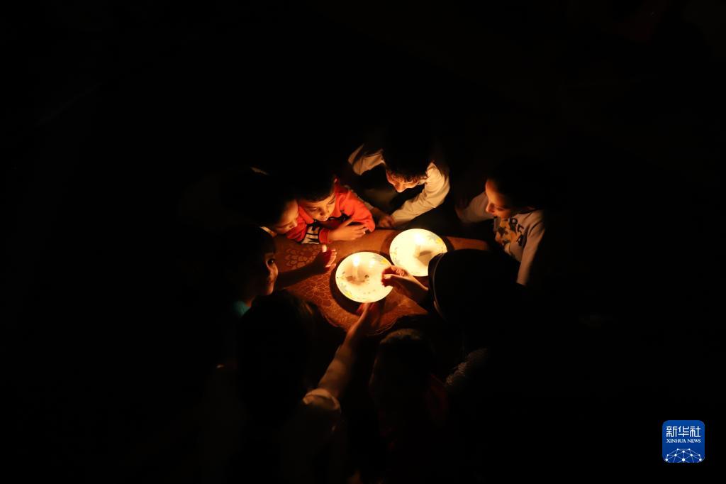 這是10月20日在加沙地帶南部城市汗尤尼斯拍攝的使用蠟燭照明的兒童。