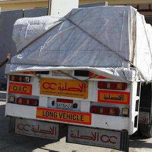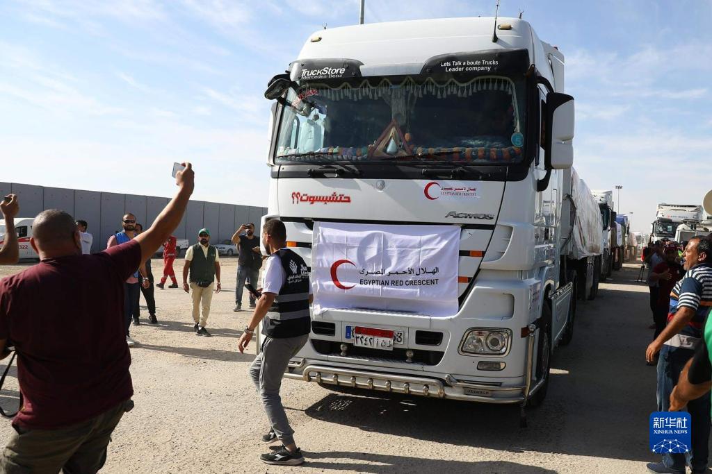 10月21日,在拉法口岸埃及一側,裝載有人道援助物資的貨車(chē)準備通過(guò)拉法口岸。