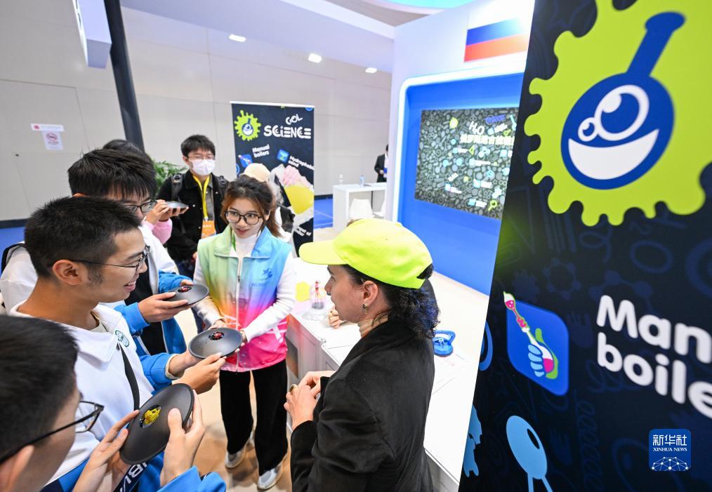 10月20日,學(xué)生在俄羅斯展臺與科普人員互動(dòng)。