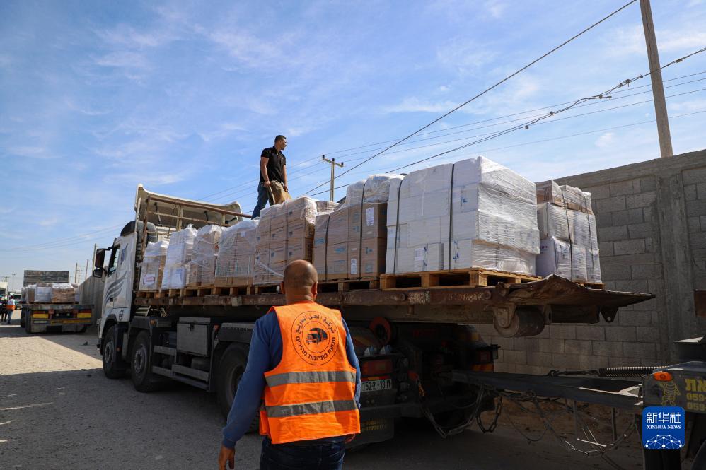 10月21日,工作人員在加沙地帶南部城市拉法卸貨。