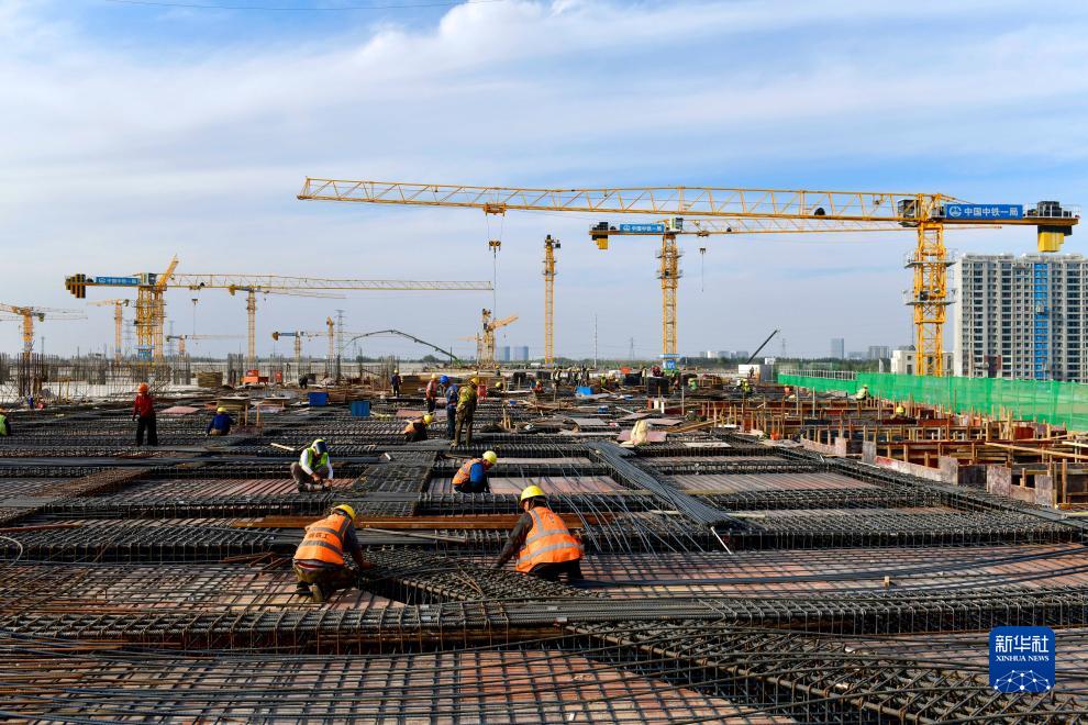 10月21日,在濟南地鐵6號線(xiàn)位里莊車(chē)輛段,中鐵一局的工作人員在進(jìn)行主體蓋板施工(無(wú)人機照片)。