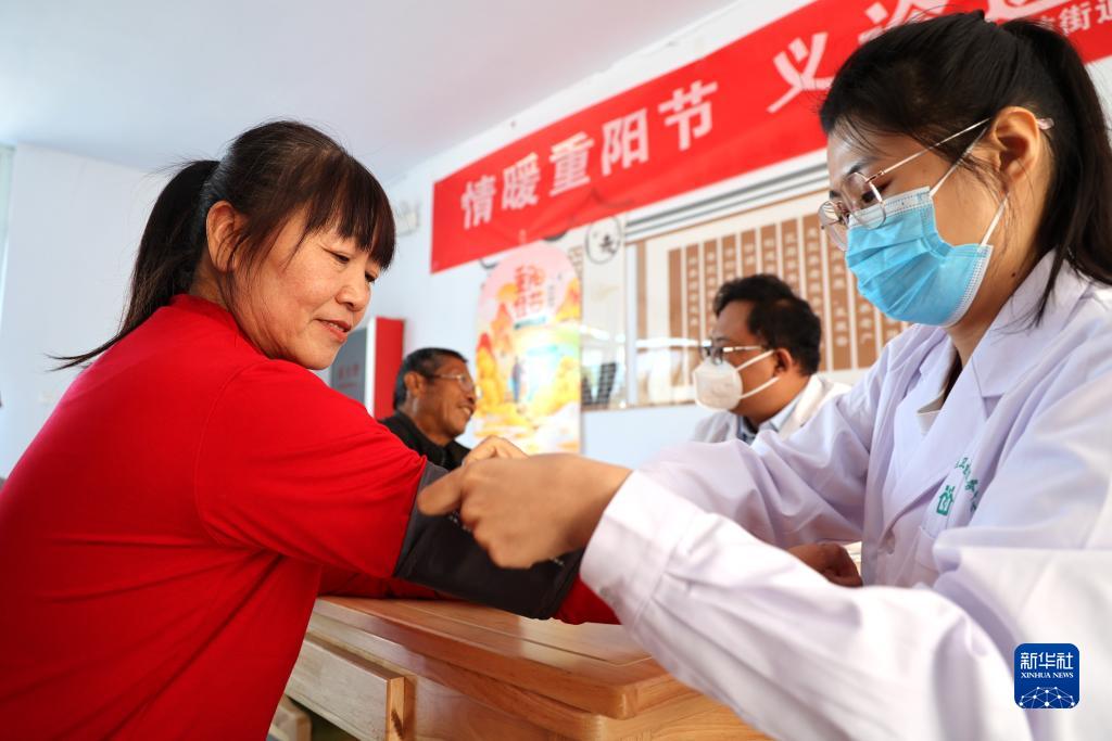 10月21日,在山東省濱州市一處養老服務(wù)中心,志愿者為老人測量血壓。