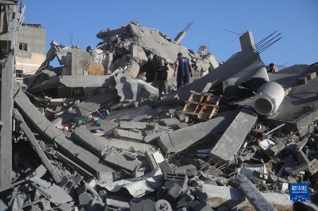 10月21日,在加沙地帶南部城市拉法,人們站在遭以色列襲擊的建筑廢墟上。