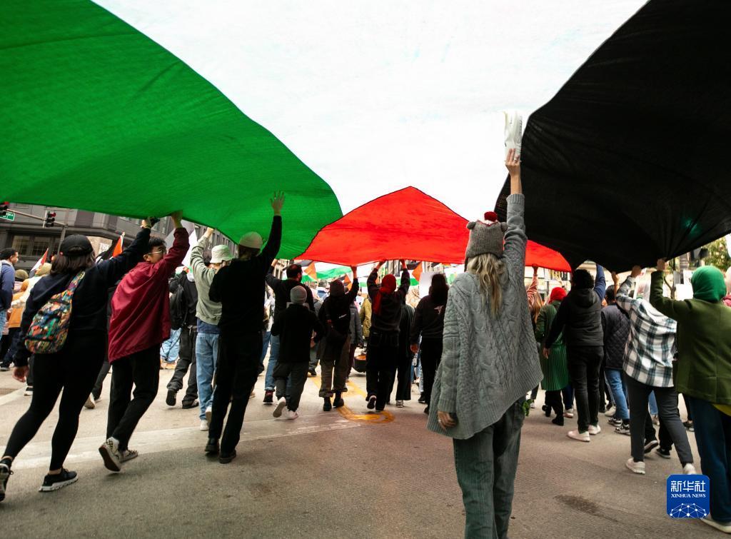 當天,芝加哥民眾走上街頭參加游行活動(dòng),表達對巴勒斯坦人民的支持,抗議以色列對加沙地帶的封鎖。