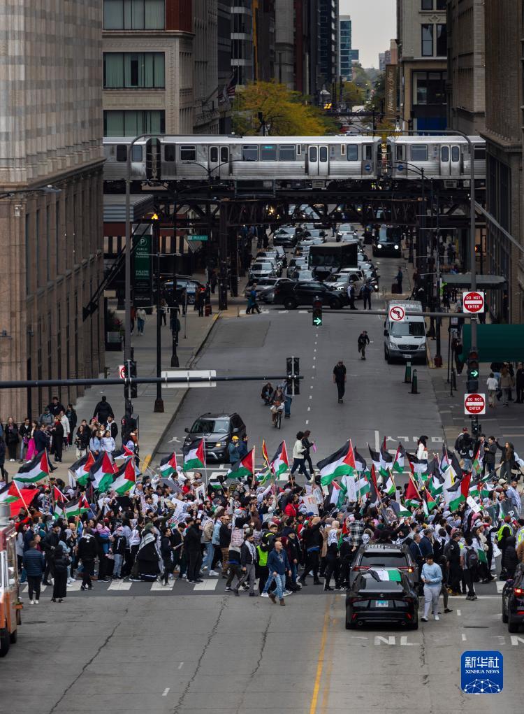 當天,芝加哥民眾走上街頭參加游行活動(dòng),表達對巴勒斯坦人民的支持,抗議以色列對加沙地帶的封鎖。