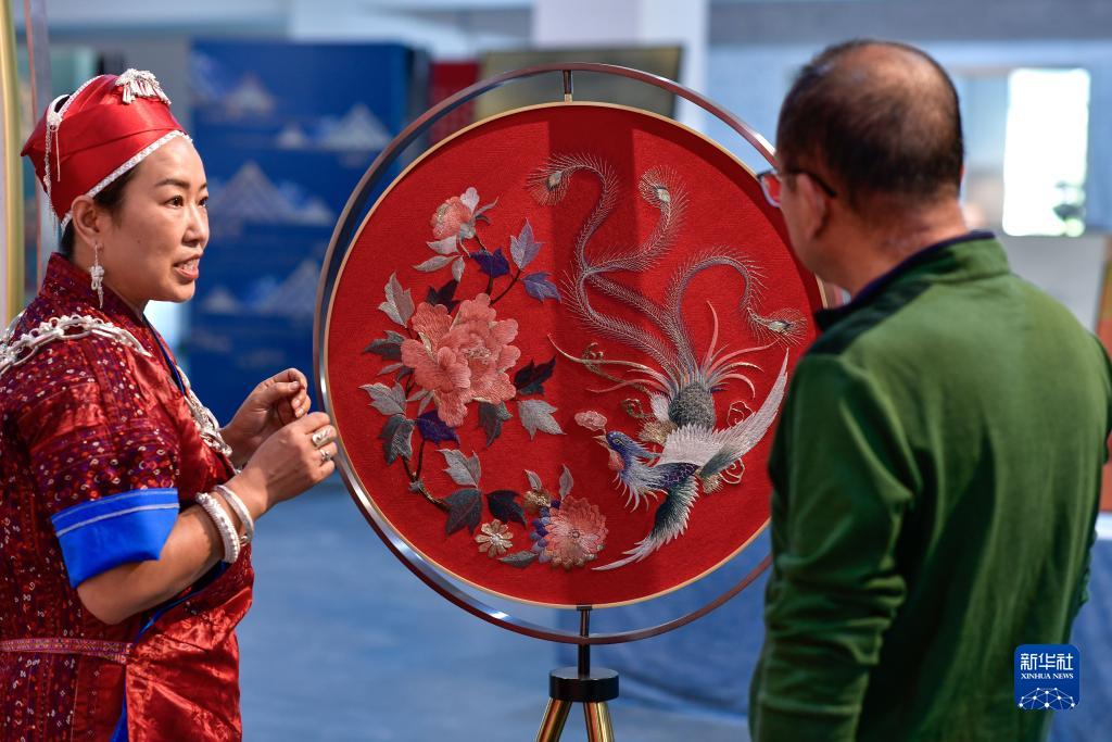 深秋的?陽(yáng)河畔,天氣逐漸轉涼。在手工刺繡車(chē)間,龍祿穎與繡娘們以針當筆,以線(xiàn)為墨,將花、鳥(niǎo)、魚(yú)、蝴蝶等元素繡在繡片上,一幅幅配色大膽活潑、圖案栩栩如生的苗繡作品,在指尖上下穿梭間誕生。
