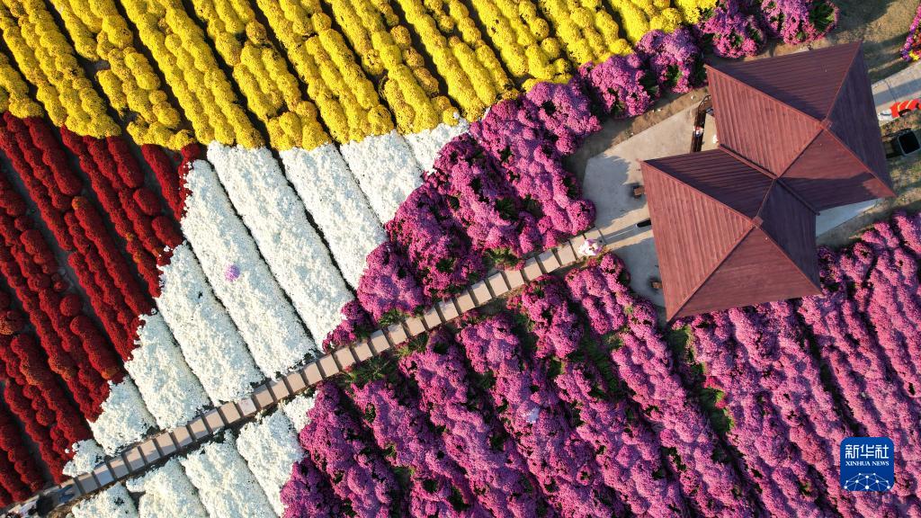 這是10月21日在江蘇射陽(yáng)縣洋馬鎮拍攝的第二十八屆洋馬菊花節現場(chǎng)(無(wú)人機照片)。