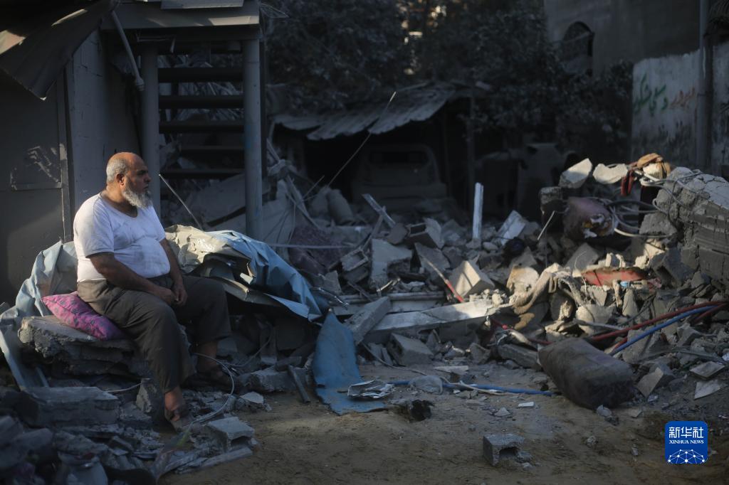 10月22日,在加沙地帶南部城市汗尤尼斯,一名男子坐在遭以色列襲擊損毀的建筑廢墟上。