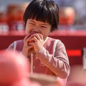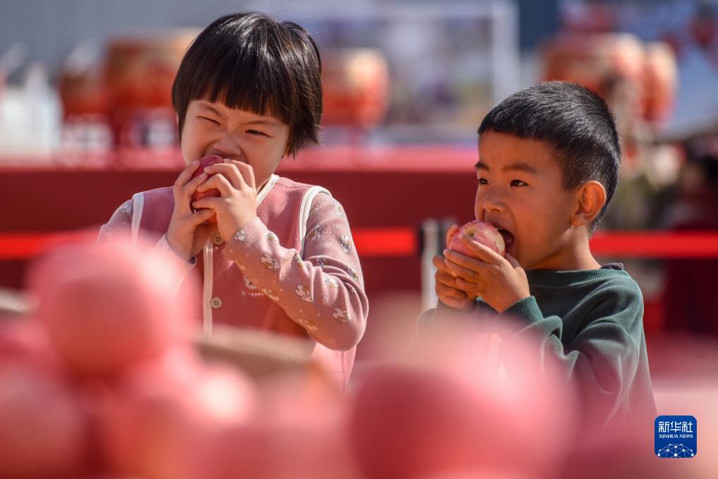 10月22日,兩名小朋友在山東沂源蘋(píng)果節上品嘗參展蘋(píng)果。