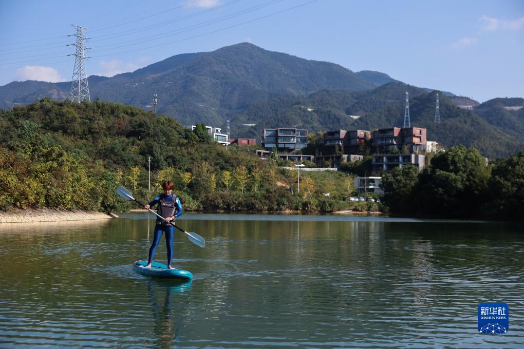 10月23日,游客在建德市楊村橋鎮嶺源樂(lè )活島休閑基地體驗水上運動(dòng)項目“槳板”。