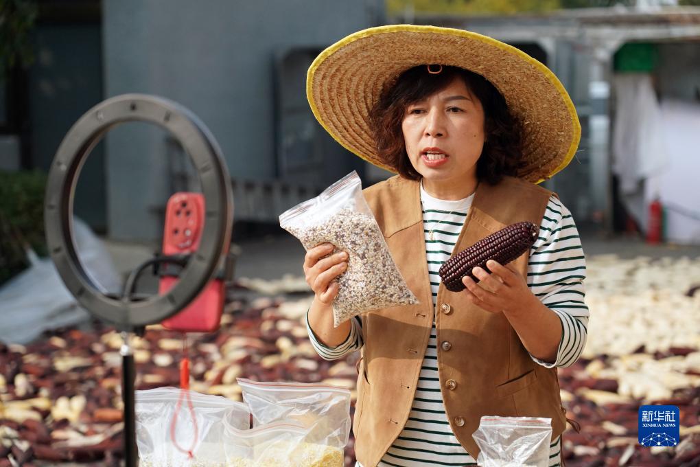 在北京市平谷區北臺頭村村委會(huì ),王翠云通過(guò)視頻直播銷(xiāo)售玉米產(chǎn)品(10月23日攝)。