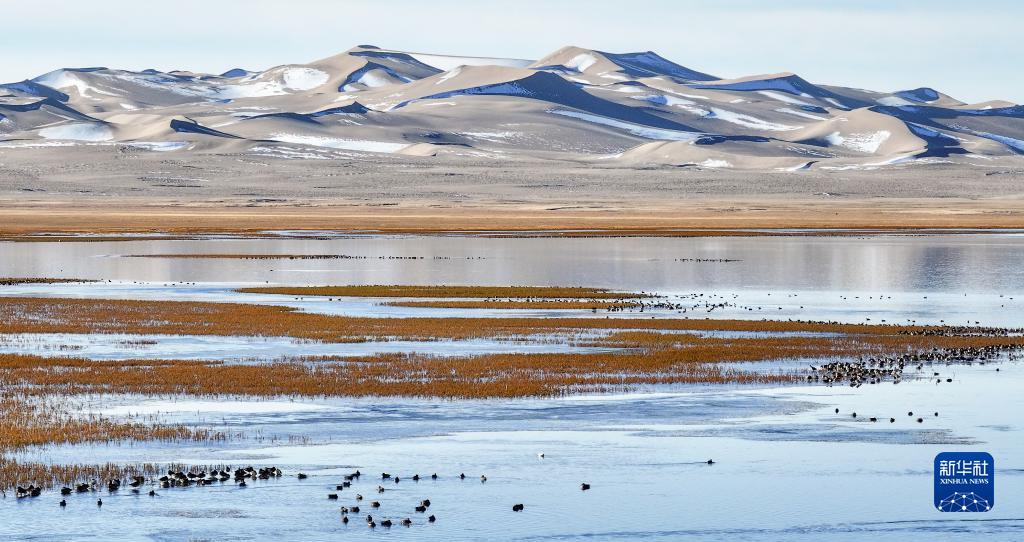 10月18日,在阿爾金山國家級自然保護區,針尾鴨等水鳥(niǎo)在依協(xié)克帕提湖棲息(無(wú)人機照片)。