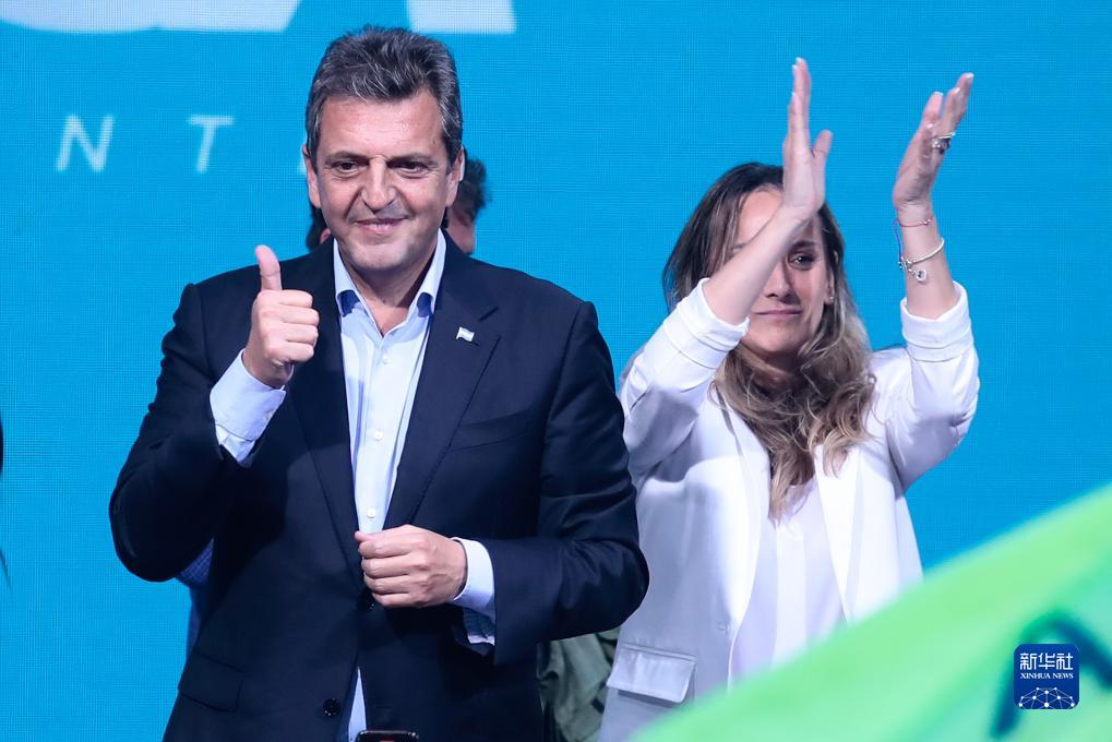 10月22日,阿根廷中左翼執政聯(lián)盟祖國聯(lián)盟候選人、現任經(jīng)濟部長(cháng)塞爾希奧·馬薩(左)在位于首都布宜諾斯艾利斯的競選總部慶祝在首輪投票中領(lǐng)先。