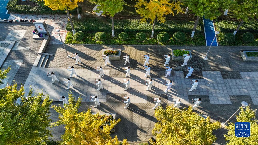 10月23日,河北省遵化市老年太極拳愛(ài)好者在“九九重陽(yáng)”太極拳健身主題活動(dòng)中打太極拳(無(wú)人機照片)。