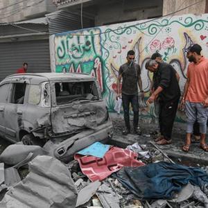 10月23日,人們在加沙城查看空襲后的受損建筑和車(chē)輛。