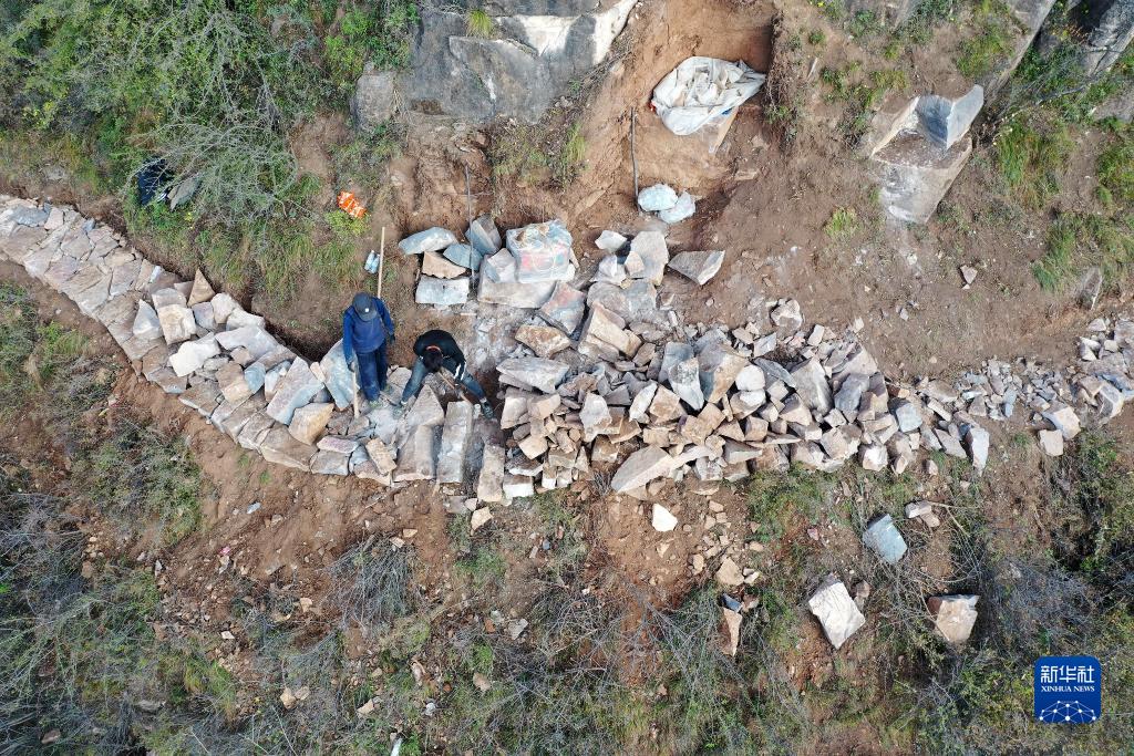 村民們在太行山上修路(10月18日攝,無(wú)人機照片)。