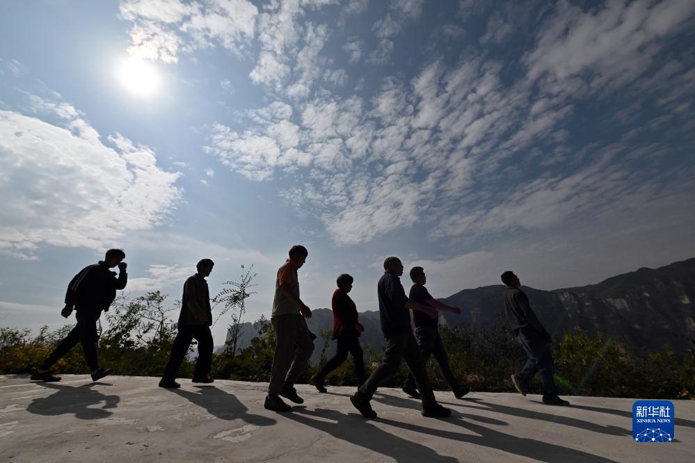 在壺關(guān)縣大峽谷鎮青龍峽村,村民們在修路間隙到山下休息(10月17日攝)。