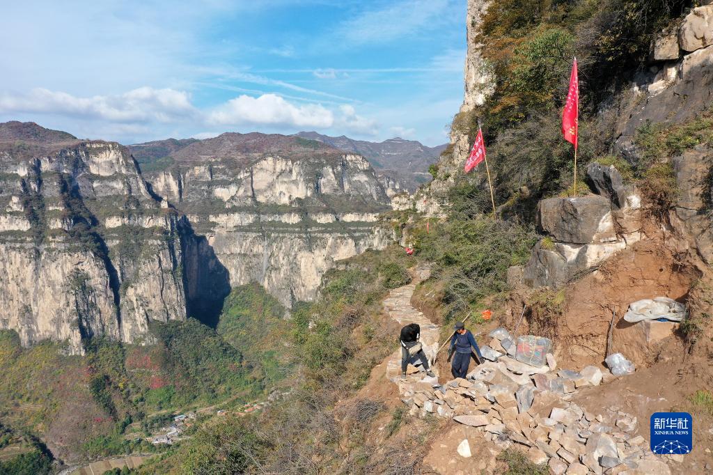 村民們在太行山上修路(10月18日攝,無(wú)人機照片)。