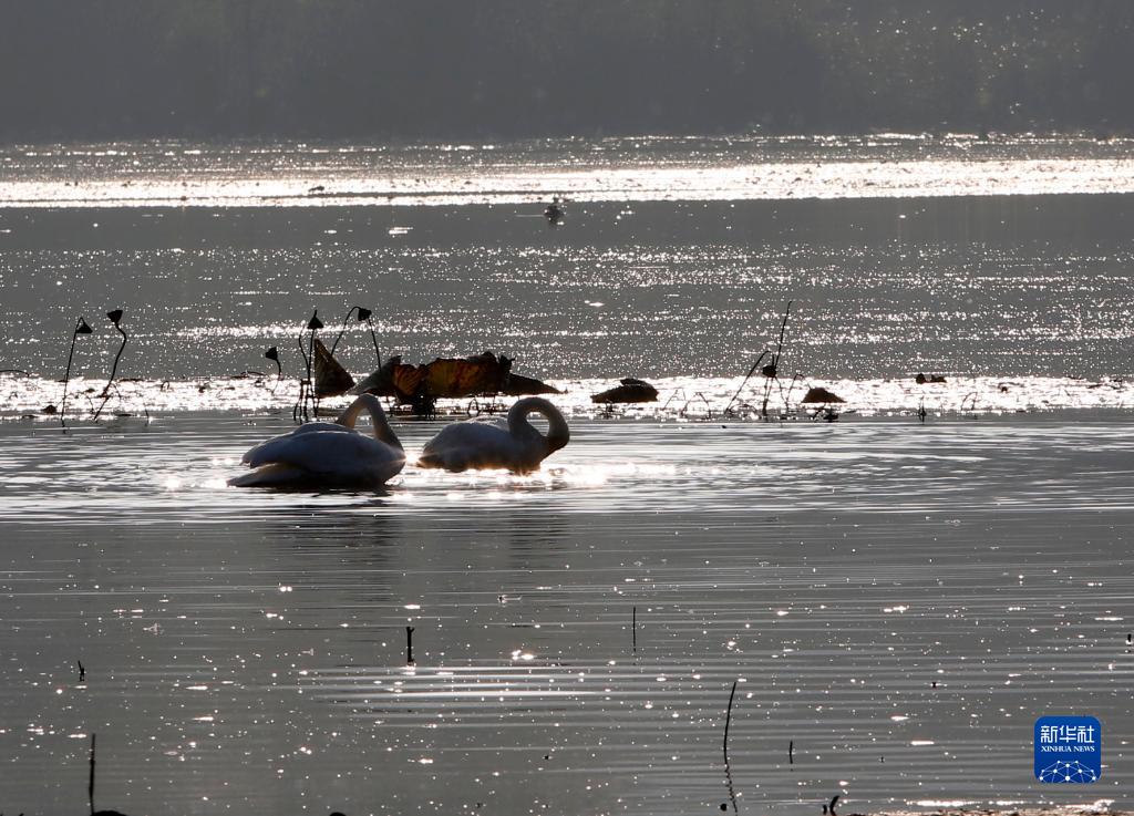 10月24日,大天鵝在三門(mén)峽市天鵝湖國家城市濕地公園內棲息。
