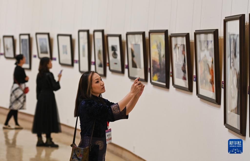 10月24日,參展嘉賓在陜西省美術(shù)博物館欣賞藝術(shù)作品。