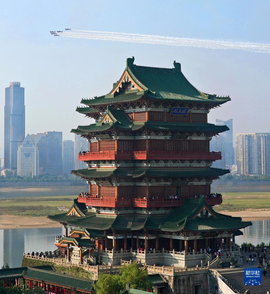 10月24日,歐洲環(huán)球之星特技飛行表演隊在南昌滕王閣景區上空進(jìn)行飛行表演。