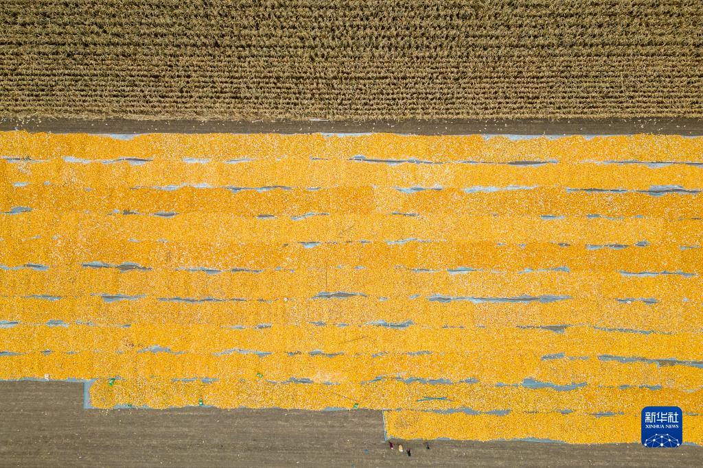 10月18日,在黑龍江省綏化市北林區張維鎮潤地農業(yè)種植合作社的一處玉米晾曬場(chǎng),村民整理收獲的玉米(無(wú)人機照片)。