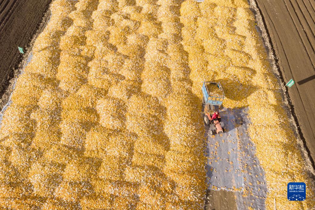 10月19日,在黑龍江省肇東市五里明鎮東升村,農民把收獲的玉米運到當地農業(yè)合作社指定的地點(diǎn)進(jìn)行晾曬(無(wú)人機照片)。