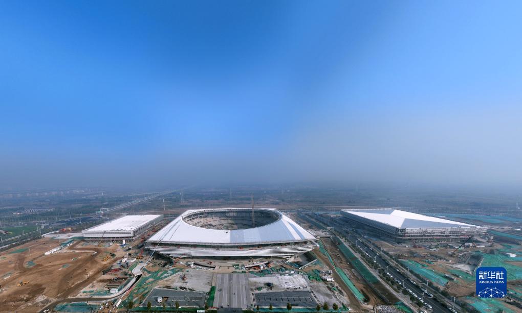 建設中的雄安體育中心體育場(chǎng)(中)、體育館(右)和游泳館(10月24日攝,無(wú)人機照片)。