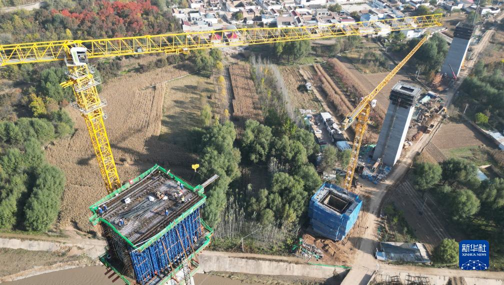 這是10月24日拍攝的位于甘肅臨夏境內的蘭合鐵路4標段北小塬大夏河特大橋墩身施工現場(chǎng)(無(wú)人機照片)。
