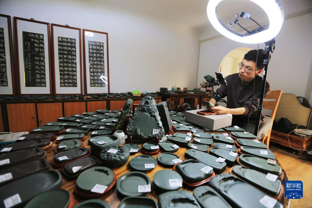 10月24日,工作人員在甘肅省定西市臨洮縣直播銷(xiāo)售洮硯。
