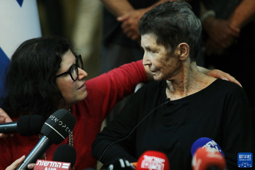 10月24日,獲釋的以色列被扣押人員約赫韋德· 利夫希茨(右)在以色列特拉維夫接受采訪(fǎng)。