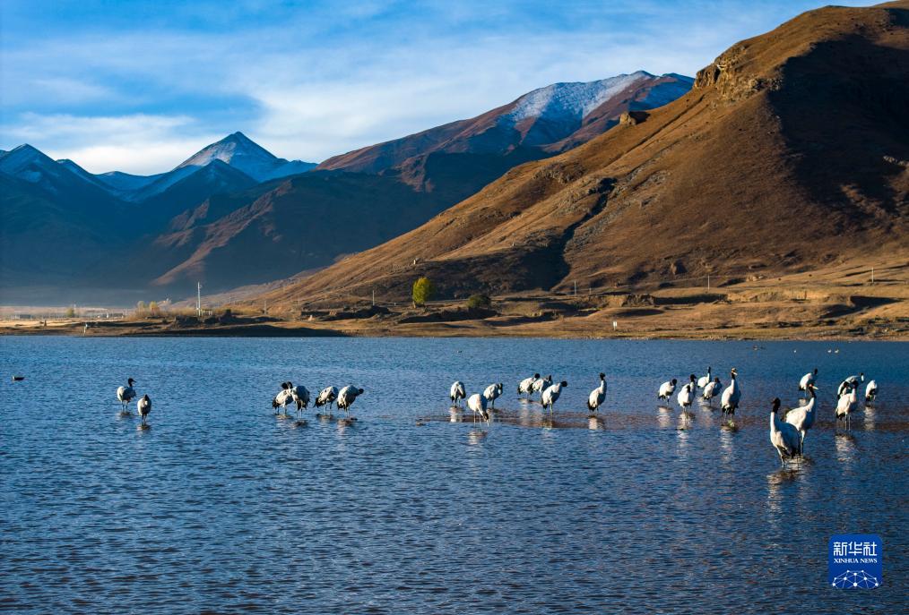 10月下旬,西藏自治區拉薩市林周縣迎來(lái)2023年第一批越冬黑頸鶴。它們將在這里一直待到來(lái)年三四月份。黑頸鶴是國家一級保護動(dòng)物,主要棲息在海拔2500米至5000米的高原、草甸、沼澤地帶。拉薩北部的林周縣平均海拔約4200米,是黑頸鶴的主要越冬地之一。