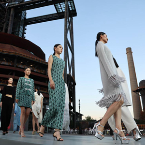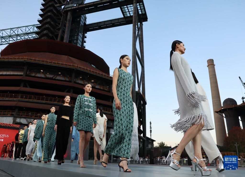 模特在北京首鋼園三高爐南廣場(chǎng)走秀(2022年9月1日攝)。首鋼凝結著(zhù)首都的工業(yè)記憶,經(jīng)過(guò)重新設計與改造,以三高爐為代表的首鋼工業(yè)地標煥發(fā)新活力,助力首都高質(zhì)量發(fā)展。