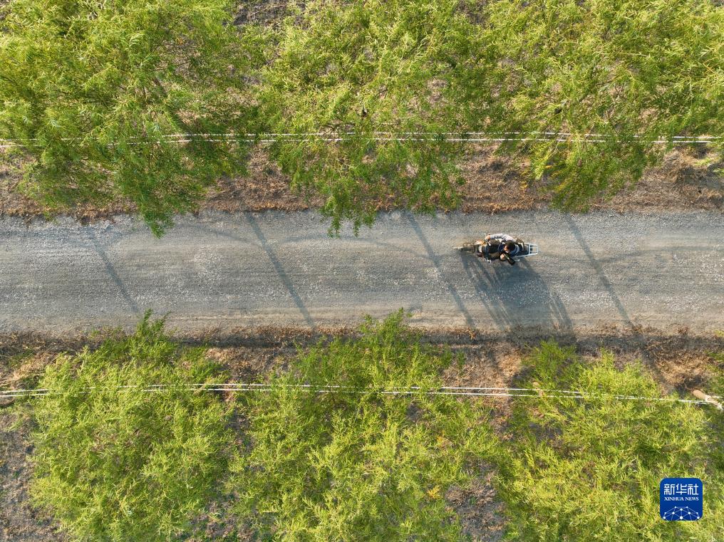 10月24日,韓戰橋在雄安新區孝義河河口濕地騎摩托車(chē)巡護(無(wú)人機照片)。
