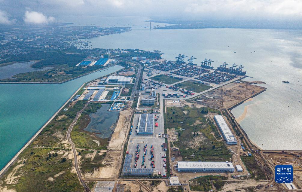 10月25日拍攝的洋浦港封關(guān)運作項目和洋浦國際集裝箱碼頭(無(wú)人機照片)。