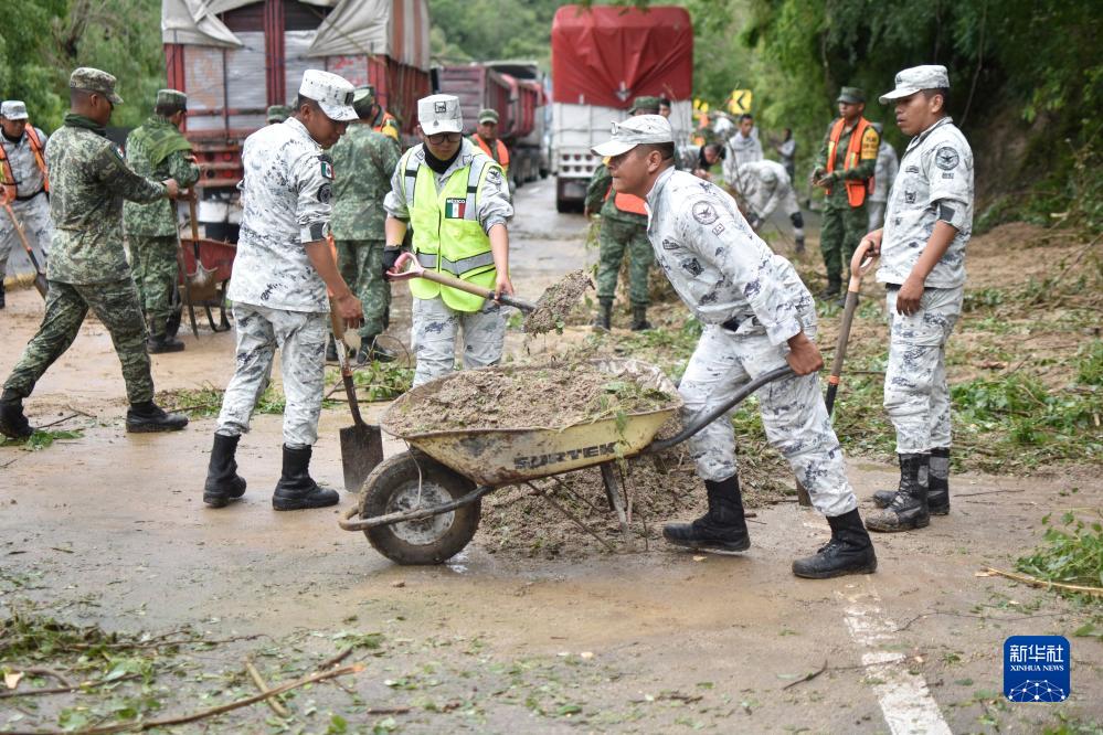 10月25日,在墨西哥格雷羅州奇爾潘辛戈市,軍人和國民警衛隊清理因颶風(fēng)“奧蒂斯”過(guò)境而堵塞的道路。