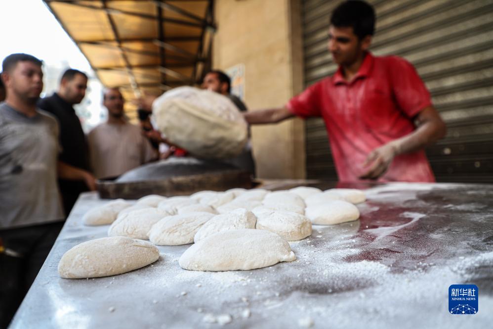10月25日,在加沙地帶南部城市汗尤尼斯,烘焙店工作人員在制作食品。