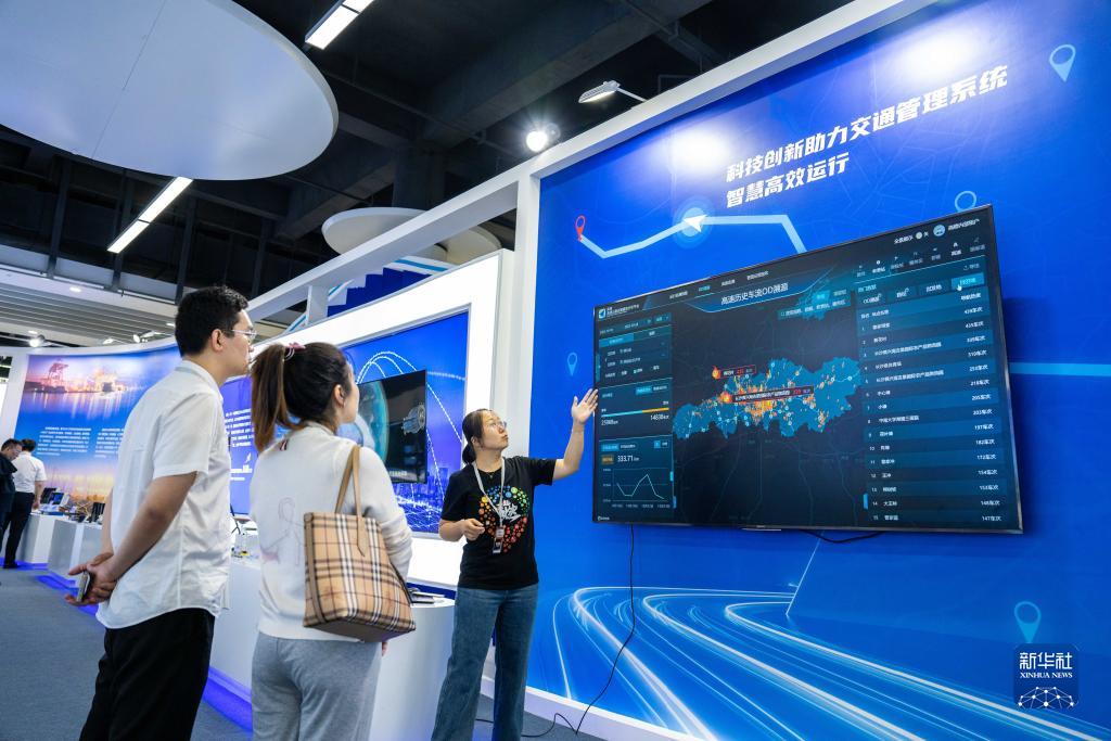 10月26日,在株洲國際會(huì )展中心,工作人員(右一)向觀(guān)眾介紹北斗技術(shù)在交通管理系統中的應用。