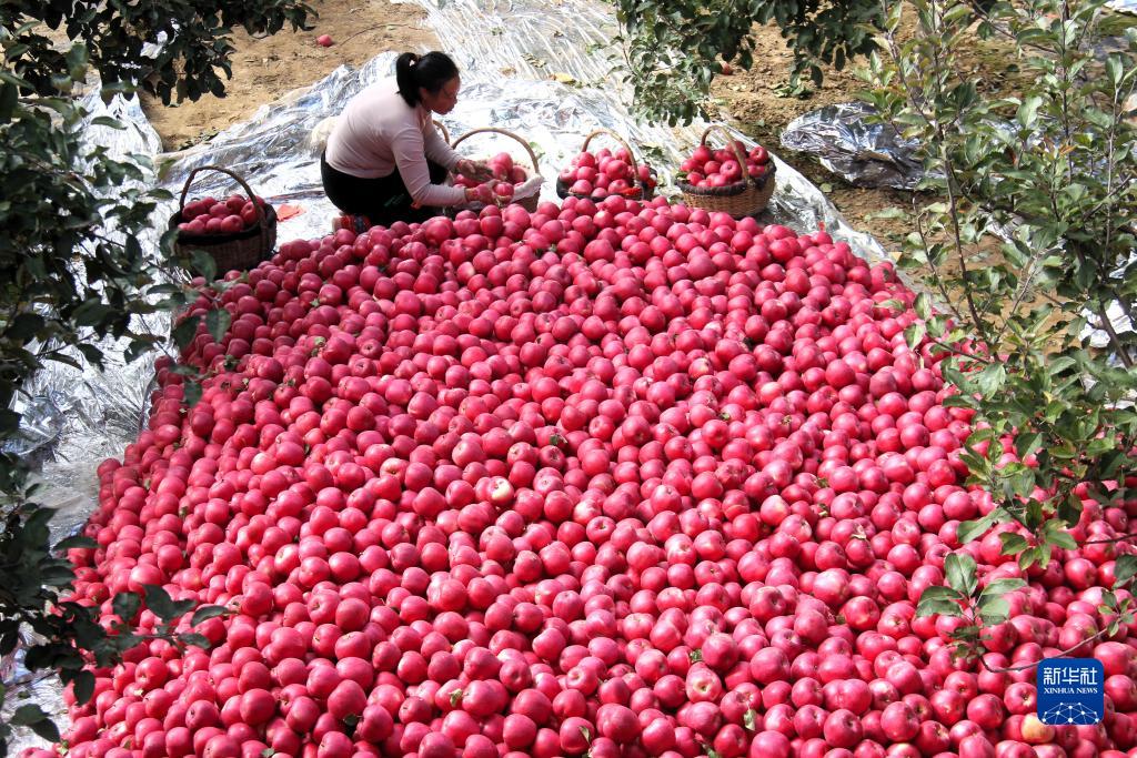 10月24日,在甘肅省平?jīng)鍪徐o寧縣余灣鄉王坪村村民分揀蘋(píng)果。
