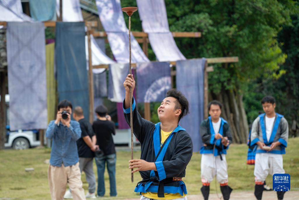 10月26日,表演者在瑤山古寨景區為游客展示陀螺技藝。